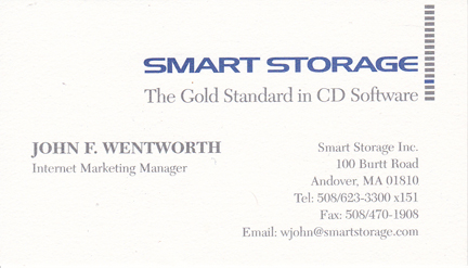 Smart Storage is a small software company based in Andover, Massachusetts. Their products include software for recording data CDs and DVDs, and software that manages multi-user access (and, in some cases, recording) to collections of optical media (CD, DVD, Magneto-Optical) in jukeboxes. As the Marketing Comunications Coordinator for Smart Storage from 1994 to 1995 I managed or was involved with every aspect of the company's marketing, including: