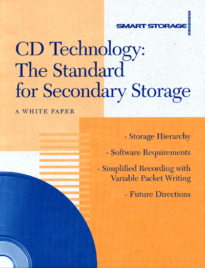 White papers. Although more common to larger companies, Smart Storage's principals felt that a white paper would help position the company as the expert in CD technology. Their first white paper (near right), CD Technology & LAN Storage Solutions: Market Changes and Technological Advances Point to CD as the New Storage Standard was used as a fulfillment piece for several successful direct mail programs. I wrote, designed, and produced the entire 11-page document, including the 2-color cover art with bleeds off three sides.